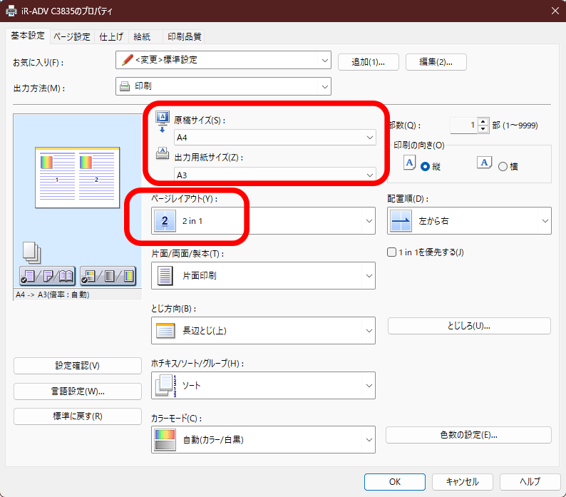 A4のページをA3の1ページに見開きで印刷したい。